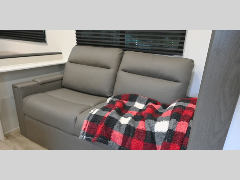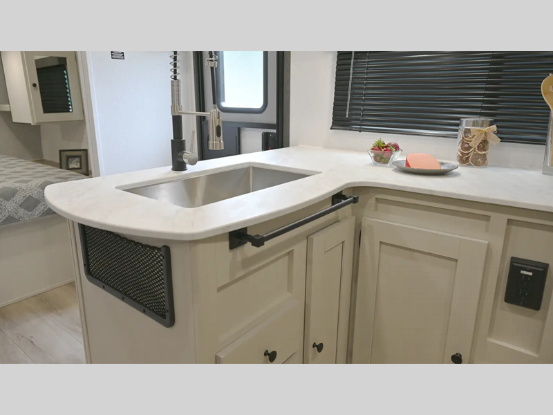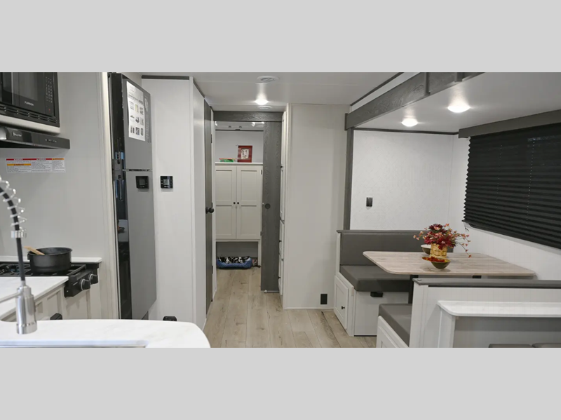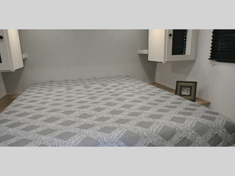 Inside, you'll be met with seamless Thermofoil countertops throughout, Congoleum linoleum flooring that is easy to keep clean, plus a Twice Cool dual ducted A/C system to keep you comfortable. The convenient exterior features, such as Keyed Alike compartment doors and a pressurized spray port, will make camping easier than ever, plus there is a power awning for added protection and solar prep for off-grid capabilities!