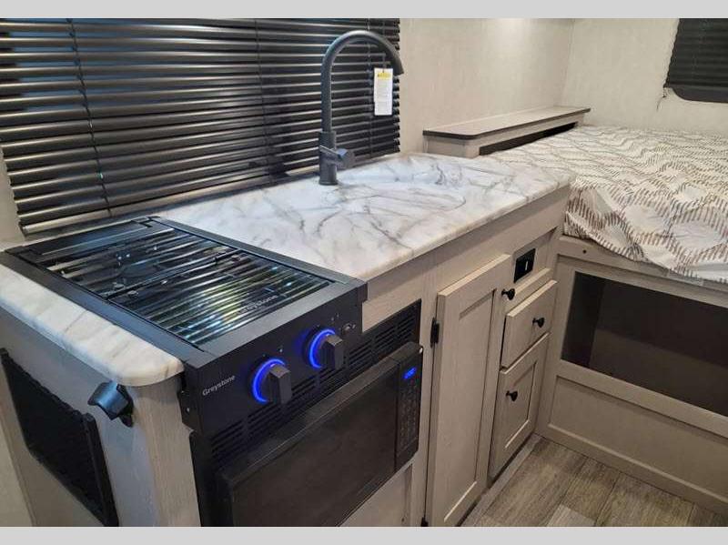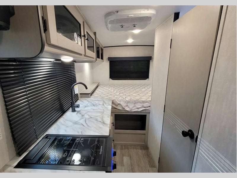 Sleeps 3 Slides 1 Length 21 ft 8 in Ext Width 7 ft Ext Height 9 ft 10 in Hitch Weight 378 lbs GVWR 4700 lbs Dry Weight 3556 lbs Cargo Capacity 1144 lbs Fresh Water Capacity 52 gals Grey Water Capacity 35 gals Black Water Capacity 35 gals Tire Size 16" Available Beds Full Refrigerator Type Double Door Cooktop Burners 2 Shower Size 24" x 36" Number of Awnings 1 LP Tank Capacity 20 lbs. Water Heater Type Tankless AC BTU 15000 btu Awning Info 14' Power w/LED Light Axle Count 1 Number of LP Tanks 2 Shower Type Standard Similar Floorplans