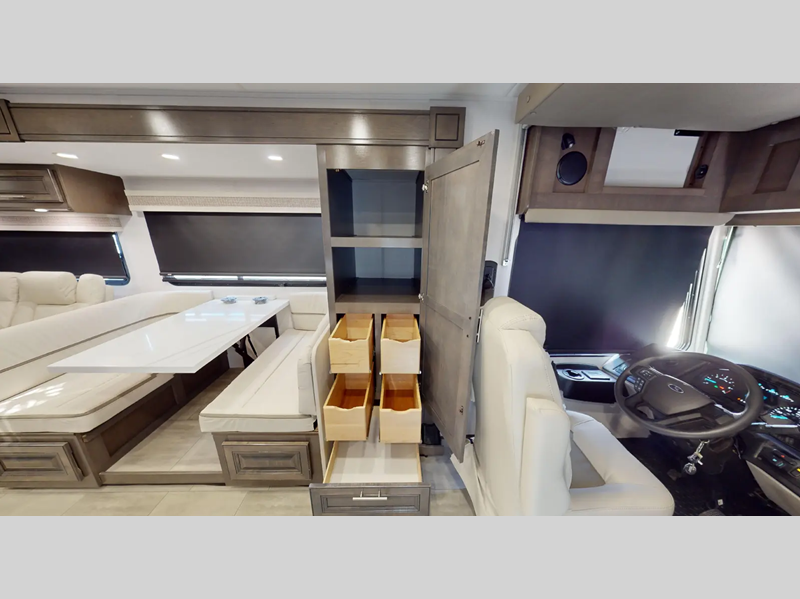 A MORryde 1.5 steel truss chassis up-fit holds them together and a hydraulic 4-point leveling system keeps them level wherever you go. If you desire to go off the grid, then you will appreciate the solar panel and 6,000-watt Yamaha generator. With a Sony 10" in-dash touchscreen radio you can play your favorite tunes, and the color side and rear cameras will make parking at the campsite easier than ever. There are also raised panel solid wood cabinet doors, spacious galleys, and plenty of storage space throughout for your belongings.