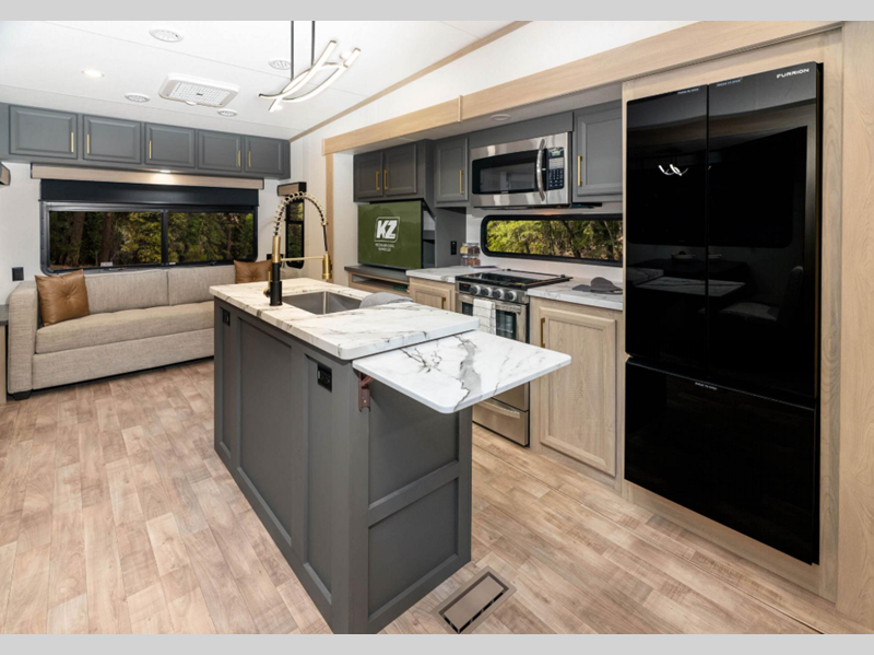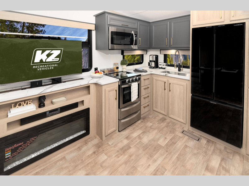 Each fifth wheel is constructed with a steel powder coated I-beam frame, a Lamilux gelcoat fiberglass exterior, fully insulated slide rooms, and durable Tufflex roofing material so you can enjoy making memories for years to come. You'll love the large ceiling crown molding inside, along with seamless countertops, night roller shades, and Beauflor flooring in the slide outs to name a few comforts. The RV Airflow A/C is 40% more efficient and the KZ Engage powered by OneControl lets you easily control your fifth wheel's functions at the touch of a button!