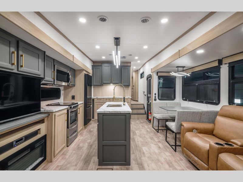 Sleeps 4 Slides 3 Length 35 ft 2 in Ext Width 8 ft Ext Height 12 ft 11 in Interior Color Mink Hitch Weight 1871 lbs GVWR 12995 lbs Dry Weight 10160 lbs Cargo Capacity 2835 lbs Fresh Water Capacity 76 gals Grey Water Capacity 50 gals Black Water Capacity 50 gals Tire Size 16" Furnace BTU 35000 btu Available Beds King Refrigerator Type French Door 12V Refrigerator Size 10 cu ft Cooktop Burners 3 Shower Size 42" x 30" Number of Awnings 2 Axle Weight 8289 lbs LP Tank Capacity 30 lbs Water Heater Type On Demand Tankless AC BTU 27000 btu TV Info LR 43" Smart LED TV Awning Info 10' 6" and 16' Power w/LED Light Strip Axle Count 2 Washer/Dryer Available Yes Number of LP Tanks 2 Shower Type Shower w/Seat Electrical Service 50 amp Similar Floorplans
