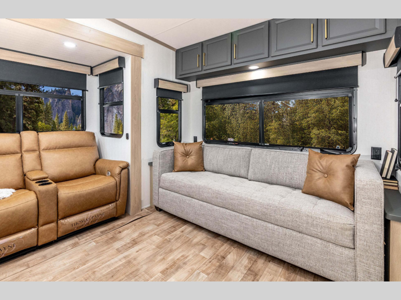 Sleeps 6 Slides 3 Length 39 ft 2 in Ext Width 8 ft Ext Height 12 ft 11 in Interior Color Mink Hitch Weight 2140 lbs GVWR 13595 lbs Dry Weight 11030 lbs Cargo Capacity 2565 lbs Fresh Water Capacity 76 gals Grey Water Capacity 90 gals Black Water Capacity 50 gals Tire Size 16" Furnace BTU 35000 btu Number Of Bunks 2 Available Beds King Refrigerator Type French Door 12V Refrigerator Size 10 cu ft Cooktop Burners 3 Shower Size 42" x 30" Number of Awnings 2 Axle Weight 8890 lbs LP Tank Capacity 30 lbs Water Heater Type On Demand Tankless AC BTU 27000 btu TV Info LR 43" Smart LED TV Awning Info 10' 6" and 16' Power w/LED Light Strip Axle Count 2 Washer/Dryer Available Yes Number of LP Tanks 2 Shower Type Shower w/Seat Electrical Service 50 amp Similar Floorplans