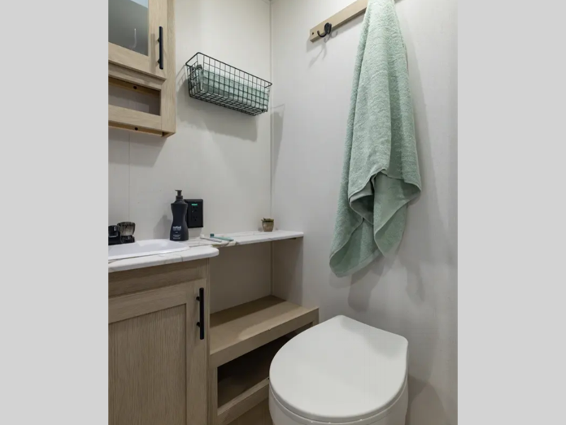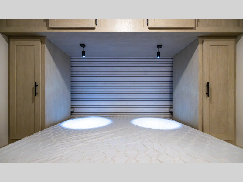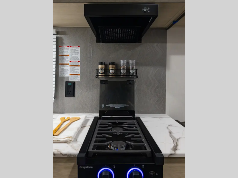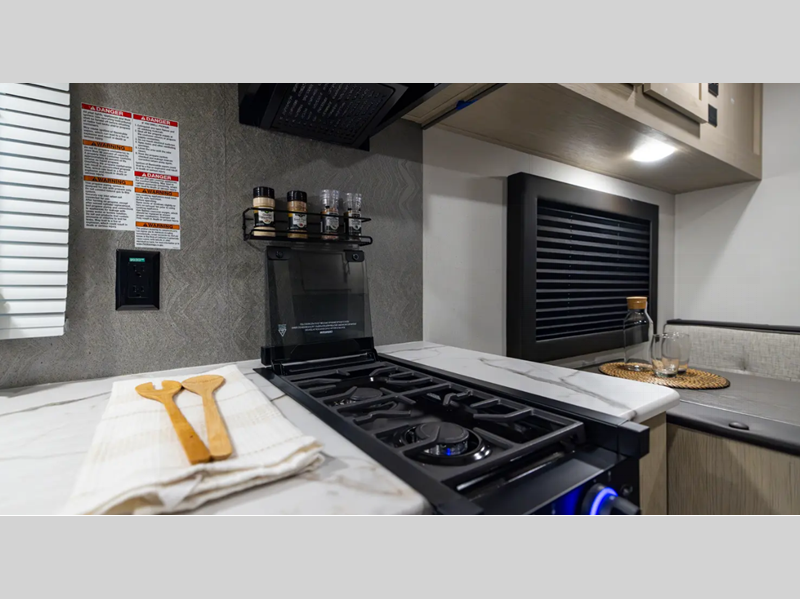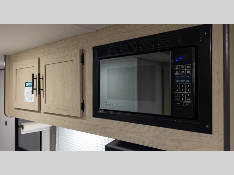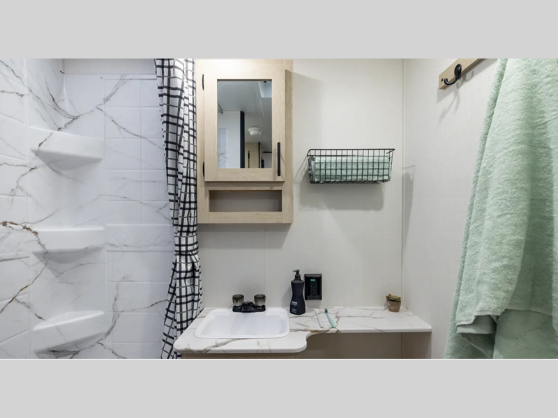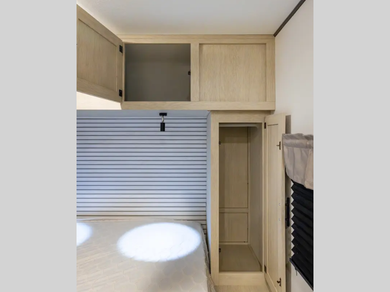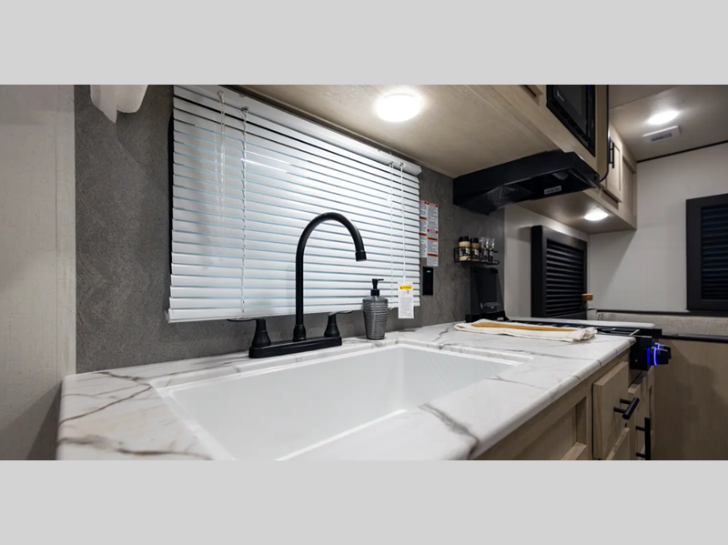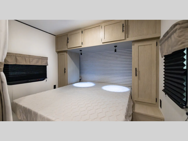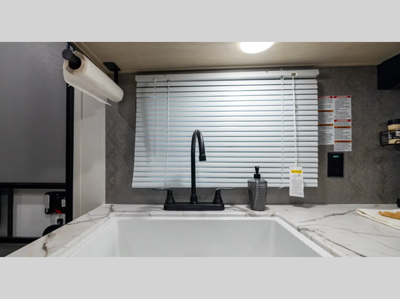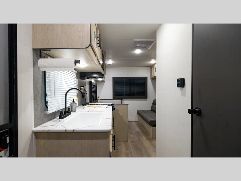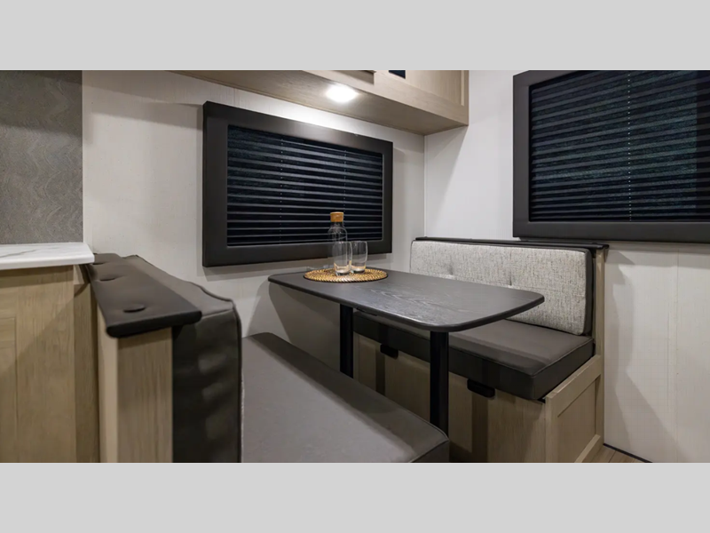 The enclosed underbelly will help protect against rock and debris as you travel to the campground, and the straight axle with electric brakes for seamless navigating. Inside, a tankless water heater will provide endless hot showers and blackout shades for restful nights. There are a few options that can be added to further customize your trailer, such as an optional power tongue jack and an optional 200W solar panel for off-grid capabilities.