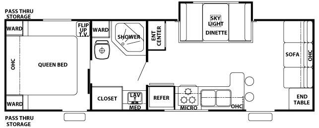 Single Slide Cherokee Lite Travel Trailer w/Rear Queen Bed, Wardrobes, Pass-Thru Storage, Flip Up TV Shelf, Separate Bedroom Entrance, Bathroom w/Wardrobe, Angle Shower, Closet, Lav., Med. Cabinet, Refrigerator, Ent. Center, 3 Burner Range, Double Kitchen Sink, 2 Stools, Booth Dinette Slideout w/Skylight, Front Sofa w/End Table and More.