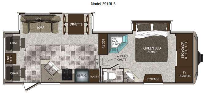 Cougar High Country Fifth Wheel by Keystone RV w/Rear Living Area Including 2 Chairs, End Table & Overhead Storage Cabinet, Sofa & Free Standing Dinette Slide, LCD TV, Pantry, Refrigerator, 3 Burner Range & Double Kitchen Sink w/Overhead Storage, Step Up to Bed & Split Bath w/Neo-Angle Shower, Private Toilet Area & Separate Sink w/Overhead, Laundry Chute, Base Storage Cabinet, Queen Bed Slide w/Nightstands, Full-Height Wardrobe w/Sliding Doors, Drawers w/TV Above and Much More!