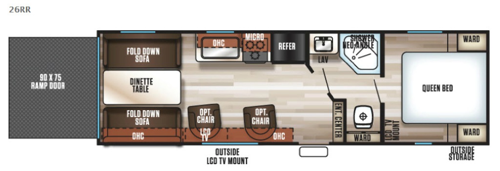 The Cherokee Grey Wolf 26RR toy hauler travel trailer by Forest River offers a rear ramp door for easy loading and unloading of your favorite off road toys. In the cargo area you will also find two fold down sofas and a dinette table. You can even choose two optional lounge chairs. The kitchen area has a large sink, three burner range, and refrigerator. In the corner of the main living area you will find an entertainment center. The bathroom is a walk thru and has a sink and corner shower on one side of the trailer and a toilet and wardrobe on the other side. In the front bedroom you will find a queen bed with two wardrobes. In the corner of the room there is a LCD mount. There are plenty of overhead cabinets throughout the travel trailer as well as outside storage and an outside LCD TV mount, plus much more!