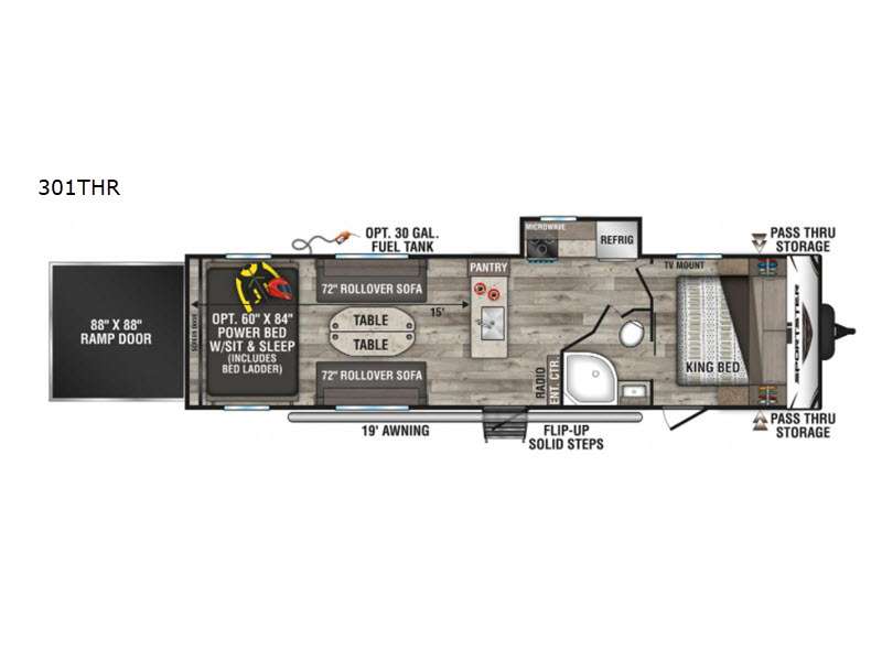 You are going to love the many types of vacations you can have with this Sportster toy hauler! The two entry doors make it easy to access different parts of your trailer, and the kitchen slide gives you extra space to prep meals. With two 72" roll-over sofas and two tables in between, you can always sit down together for dinner, and you can even use the LED TV for some extra entertainment while you eat. The master suite is going to be ultra relaxing with its king-size bed, and since there are bedside wardrobes, you can keep your clothes neatly hung.