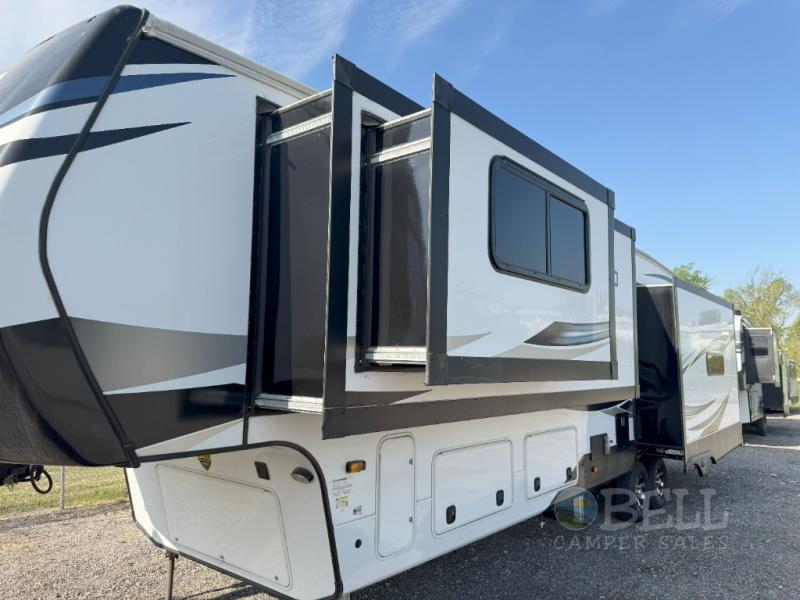 Comfort and luxury abounds throughout this fifth wheel! Starting with the dual entry bathroom which has a dual sink vanity for two to get ready at once, a 48" shower with a seat, and leads directly into the front private bedroom. Inside the bedroom is a comfortable king bed slide across from a 39" TV with a fireplace below, a dresser, and a front closet with a shoe shelf and prepped to add an optional washer and dryer. The chef can prepare their best home cooked meals with the Furrion kitchen collection and the kitchen island will make clean up easier with the stainless steel sink basin and high rise faucet with pull out spray hose. Eat your meals and play card games a the dinette then relax on either the rear tri-fold sofa or the power theater seating across from the entertainment center with a fireplace and a 50" TV to watch your favorite movies!